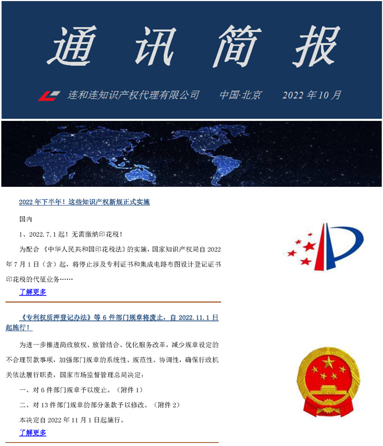 北京连和连知识产权代理有限公司2022年第10期【通讯简报】