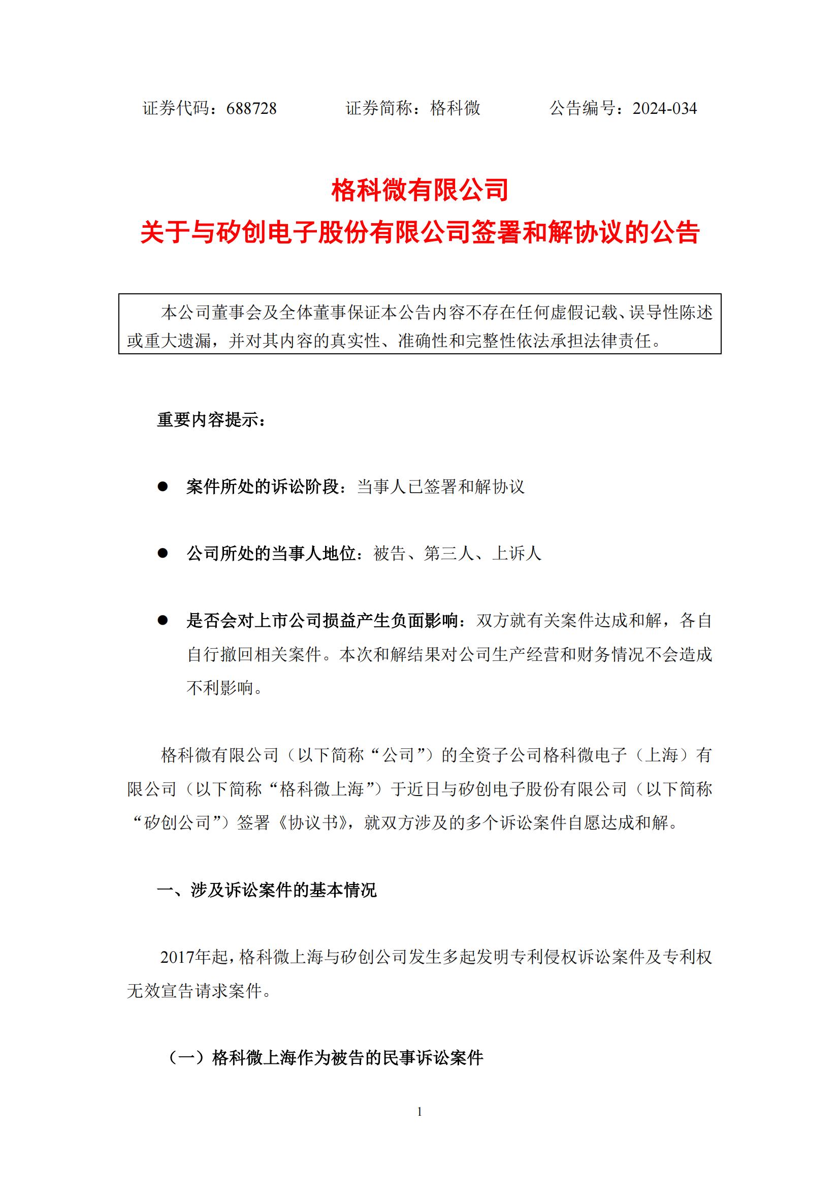 7月24日,格科微有限公司(以下简称“格科微”)发布一则关于与矽创电子股份有限公司签署和解协议的公告。