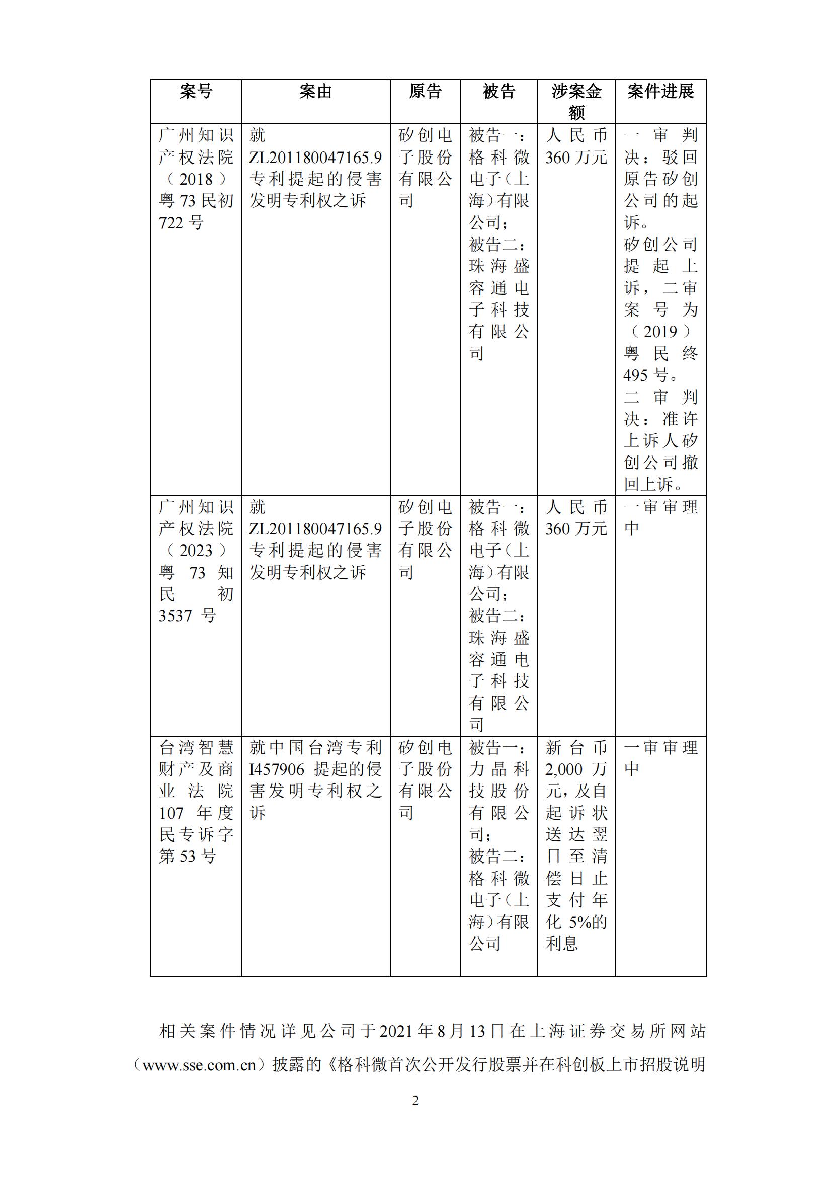 2017年12月,矽创电子主张格科微上海的GC9305、GC9306、GC9306S、GC9307产品侵犯其台湾专利I457906,要求格科微上海及其台湾晶圆代工厂力晶科技股份有限公司回收并销毁所有侵权产品,连带赔偿新台币2000万元,并自起诉状送达翌日至清偿日止支付年化5%的利息等。