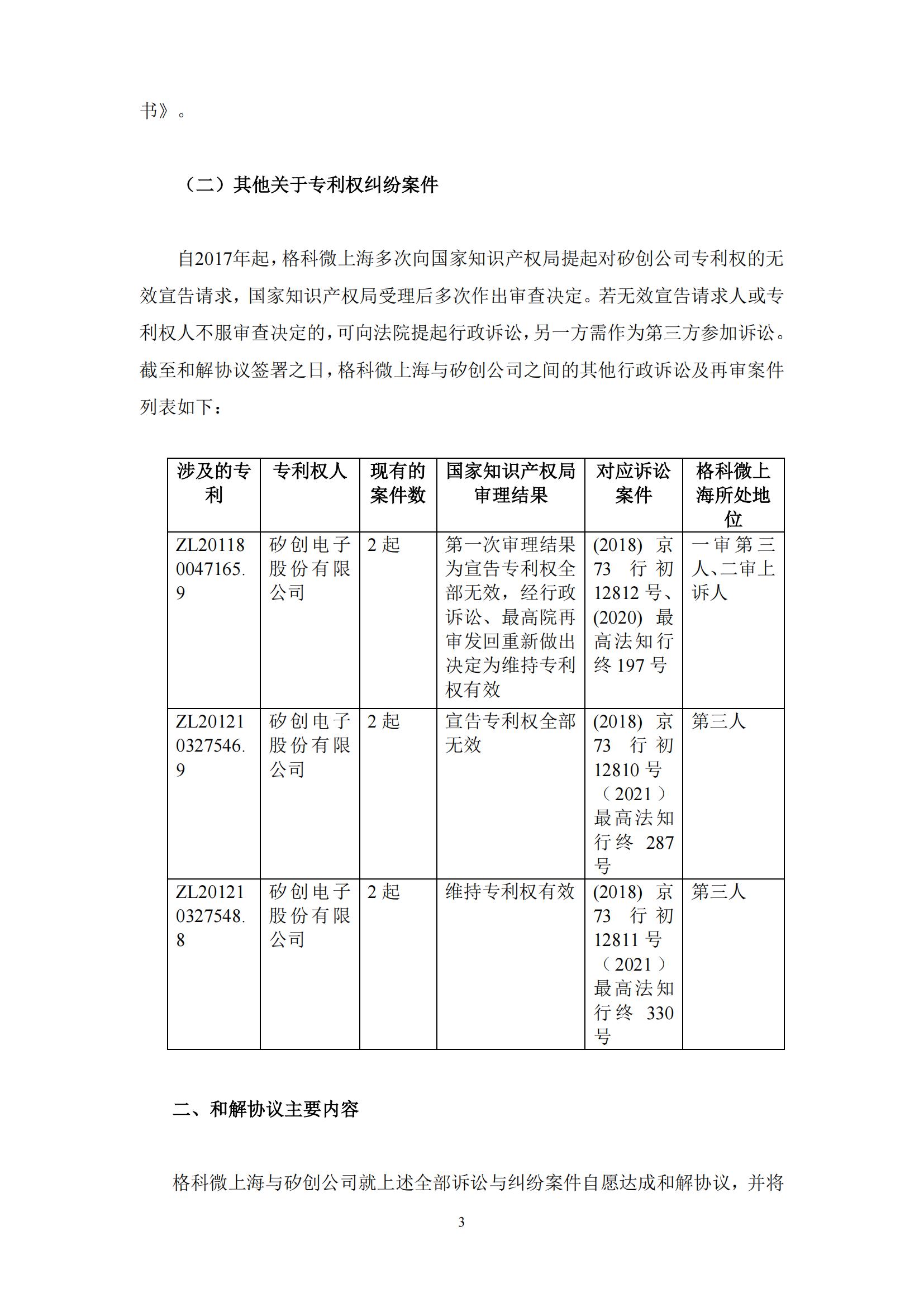 公告显示,格科微全资子公司格科微电子(上海)有限公司(以下简称“格科微上海”)与矽创电子股份有限公司(以下简称“矽创电子”)就多起发明专利侵权诉讼案件及专利权无效宣告请求案件自愿达成和解。