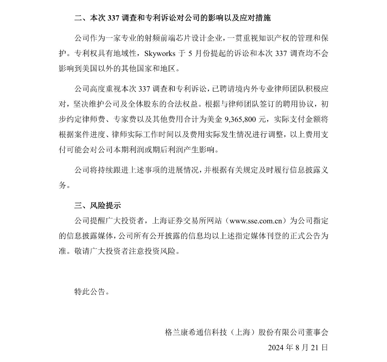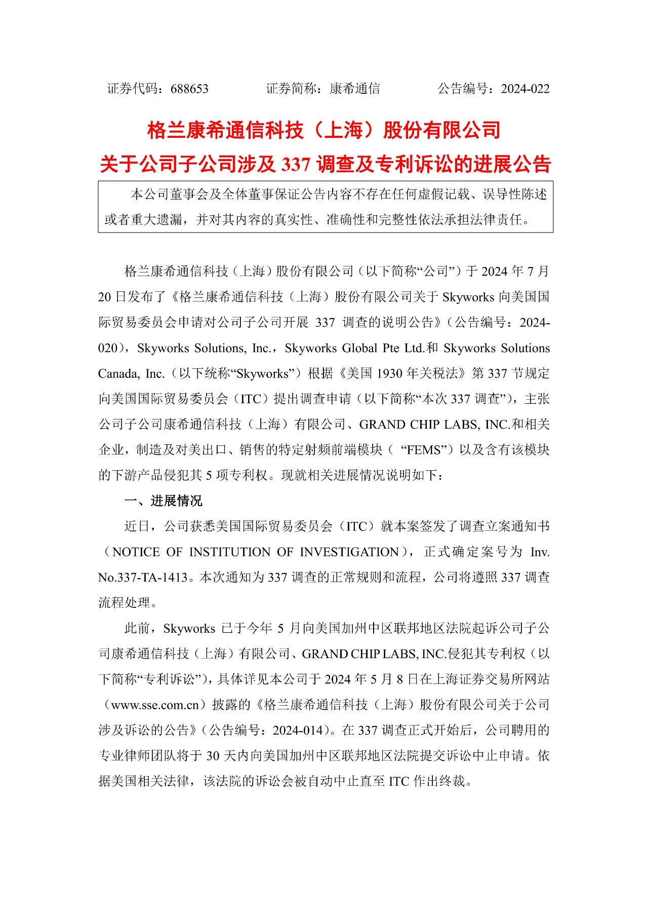 8月21日,格兰康希通信科技(上海)股份有限公司发布一则关于康希通信科技(上海)有限公司(下称“康希通信”)涉及337调查及专利诉讼的进展公告。公告显示,美国国际贸易委员会(ITC)已签发调查立案通知书,正式对无线前端模块及其下游设备启动337调查,案号为No.337-TA-1413。